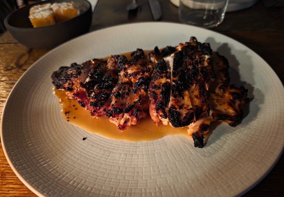 Laten we het dus eerst even over het vlees hebben. De kip is van een buitencategorie. Mais gevoerd en geweldig mals, met een lichte rooksmaak waar de miso bruine boterjus zó goed bij past. De New York Strip met de café de Paris boter is bordvullend. Ook in perfectie gegaard en ook heerlijk. Maar bij ons blijft de kip ‘hangen’.
