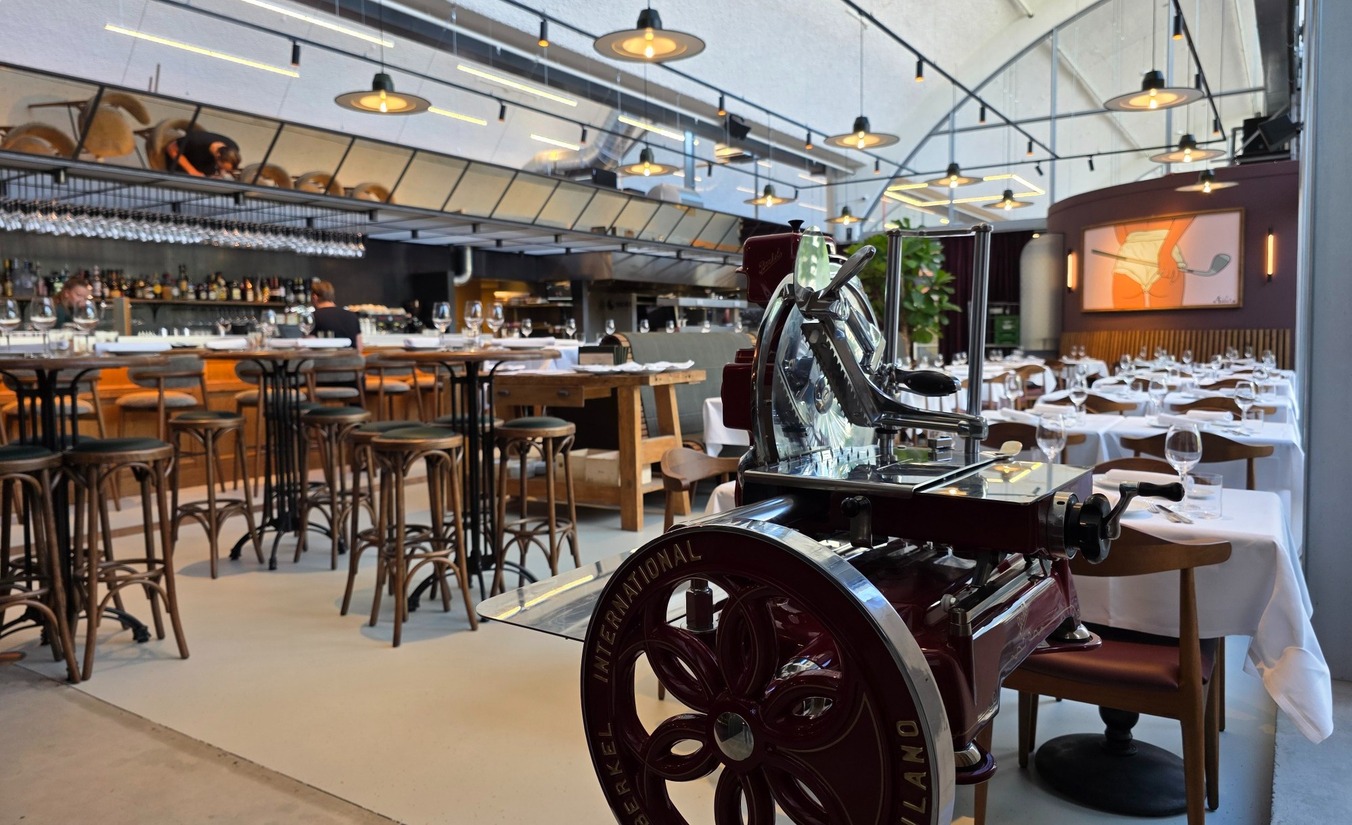 Daarna volgt een bordje, op de eigen Berkel mooi gesneden, Baskische Wagyu Cecina. We drinken er een glas gruner veltliner bij, van de familie wijngaarden van de eigenaar in Oostenrijk. Heel fijn.