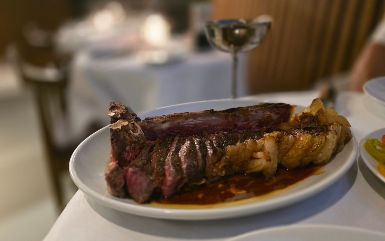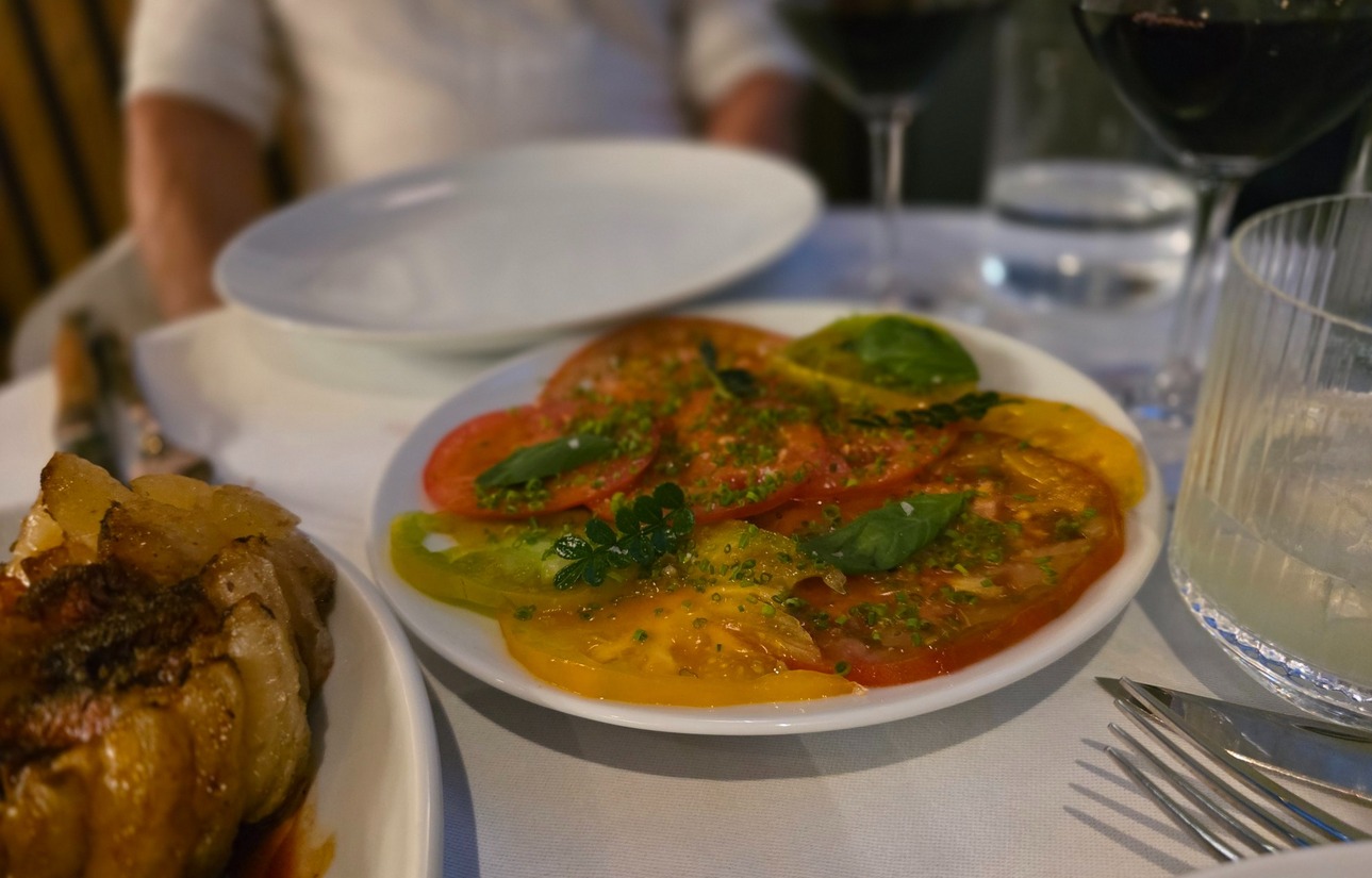 Er verschijnt een oversized, gesneden, stuk Côte de Boeuf op tafel. Mooi gerijpte Holsteiner overjarig rund. Perfect in het open vuur gegaard, met een krokant korstje maar een binnenkant zo zacht dat je het bijna kunt slurpen. Als bijgerecht is de tomatensalade met yuzu en aja amarillo een echte aanrader. Wat een smaak komt er zo in een simpele tomaat.