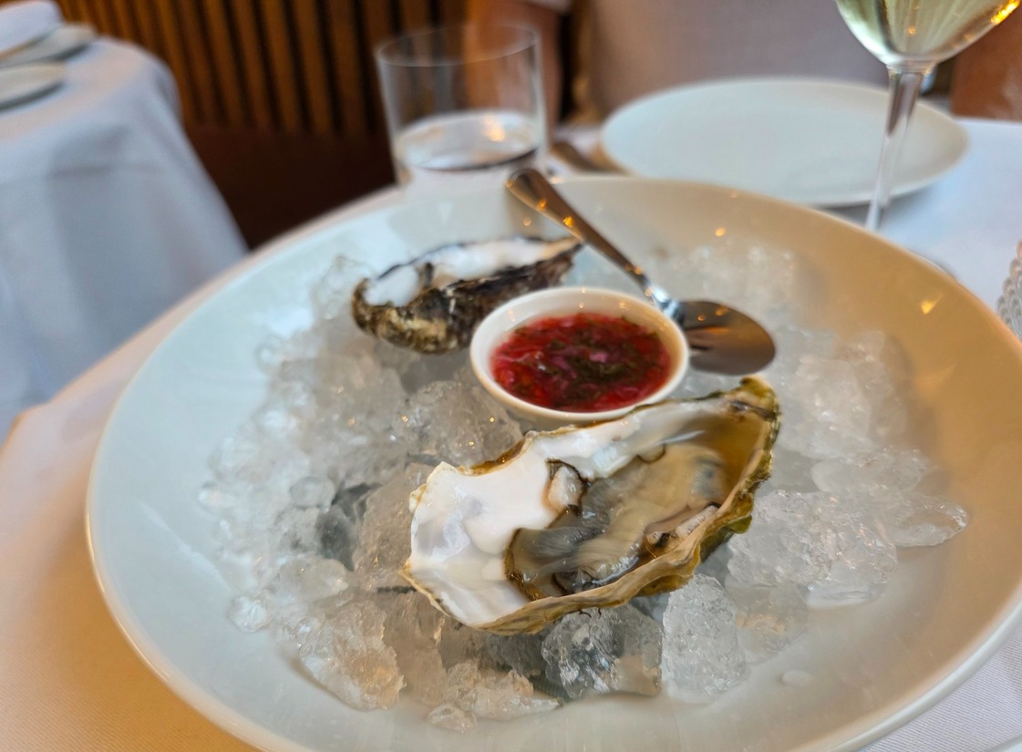 Het restaurant is een sfeervolle ruimte met een open keuken waar je direct op het vier kijkt. Timothy heeft een voorliefde voor de Baskische manier van koken. Stoer op open vuur en met af en toe een Aziatisch elementje toegevoegd. We starten met twee mooie creuses (oesters) met schist en limoen.