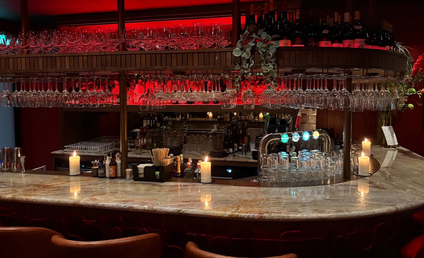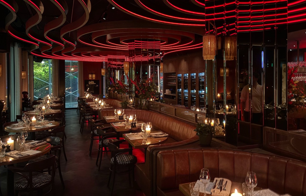 Via het grand café neem je de trap naar boven en kom je terecht in een sfeervol, sjiek interieur met bruin lederen banken. Met gedimd licht, rode plafondverlichting en kaarslicht op elke tafel heeft het de uitstraling van een high-end steakhouse. Wat ook de bedoeling was in de eerste opzet. Maar chef weg en werd er overgestapt naar een nieuw toegankelijker concept. Die van een betaalbare bistro. Slim gevonden, want iets betaalbaars vinden op het Leidseplein is een beetje als schatzoeken.