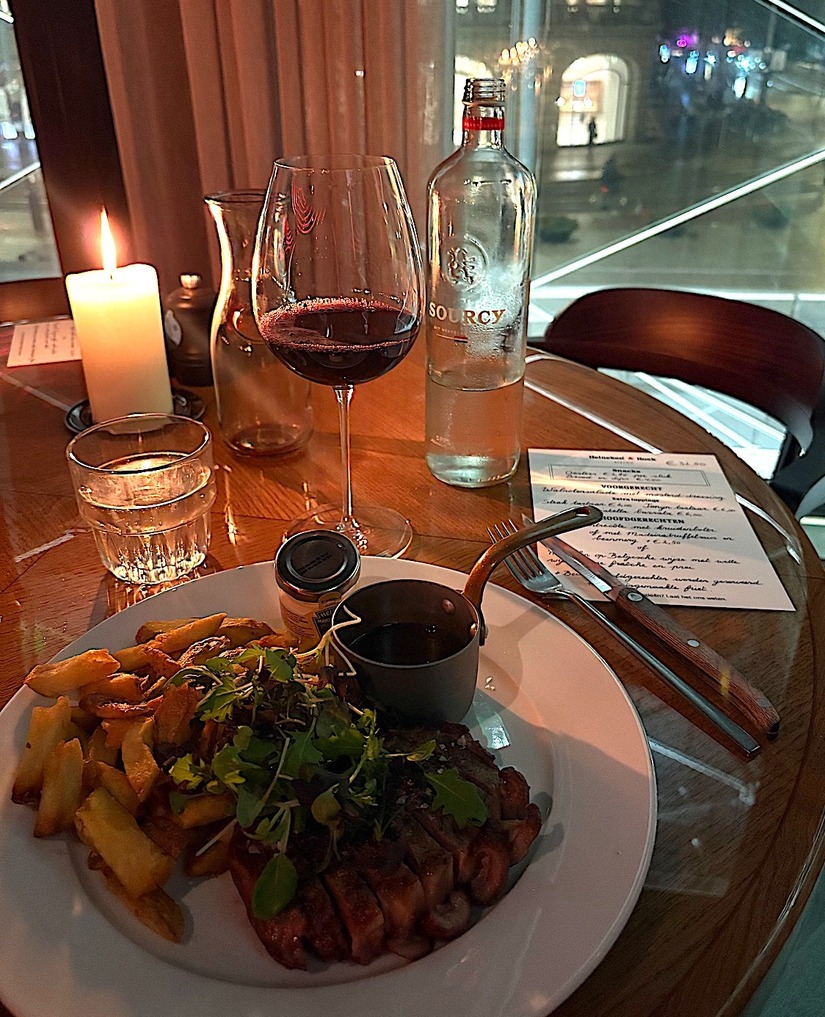 De wijnkaart is zorgvuldig samengesteld, met klassiekers en opties voor ieder budget. Een fijne toevoeging is de mogelijkheid een karafje wijn te bestellen, voor wie een hele fles net te veel vindt of een mooie wijn wil proeven zonder te veel uit te geven. Wij kozen een karafje Torcicoda primitivo van Tormaresca, uit Zuid-Italië, een volle, kruidige wijn die goed aansloot bij de gerookte entrecote.