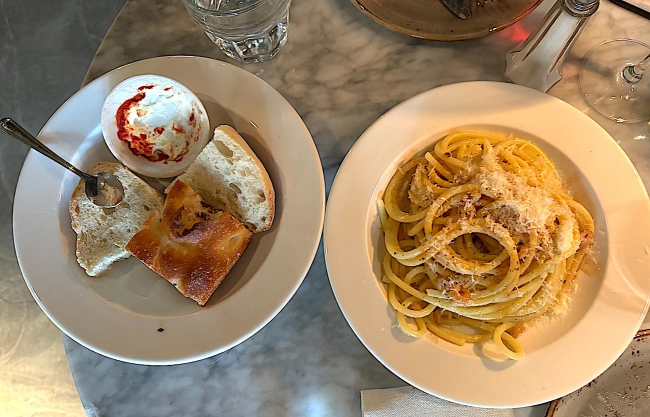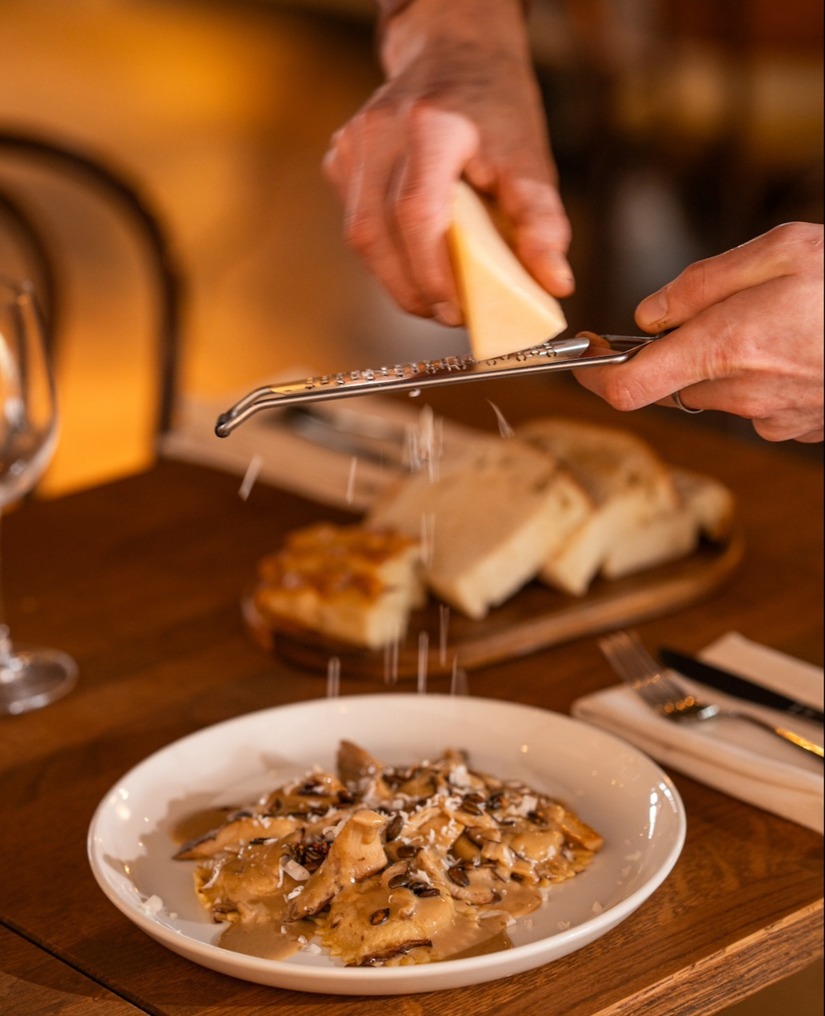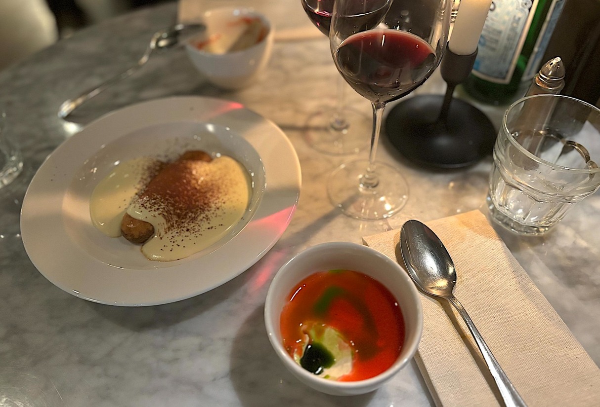 Het menu sluit goed aan op de sfeer. Zo worden er voornamelijk klassieke Italiaanse gerechten geserveerd met een moderne twist. Denk hierbij bijvoorbeeld aan een caprese burrata met een basilicum gelei of de creatieve take op een vitello met een eigenzinnige porchetta tonnato met pistache. De porchetta, traditioneel gebraden varkensvlees, viel heel erg in de smaak vanwege de luchtige saus en de grote, knapperige kappertjes.