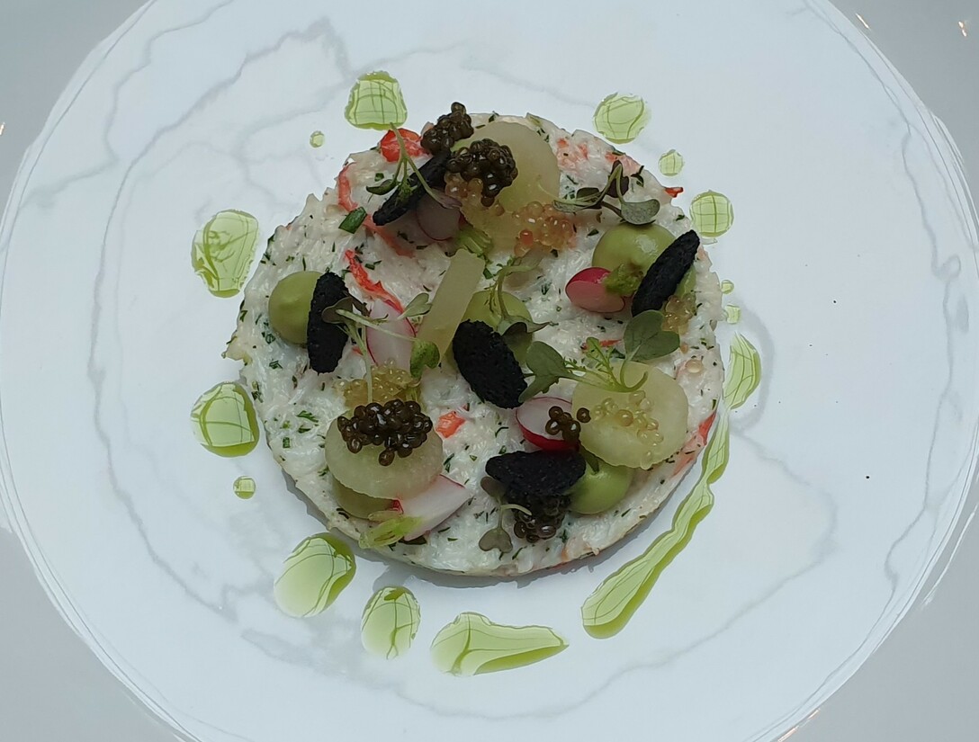 We beginnen met een gerecht voor het kerstmenu van de Brasserie: king krab uit Alaska. Deze krab wordt geserveerd met limoen, kaviaar en avocado. De krab is romig, maar door de limoen tegelijk heel erg fris. Een goed begin van je Kerstavond.