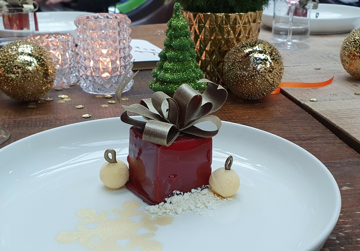 We sluiten de proeverij af met ‘Gino’s Winter Wonderland’, een gerecht bedacht voor de menukaart van de Brasserie. Dit dessert ziet eruit als een cadeautje en dat is het ook. De strik is van chocola, flinterdun en goudgekleurd. De vulling bestaat uit chocolademousse, knapperige chocoladebolletjes en een vulling van mandarijn en pistache. Ook proeven we speculaaskruiden. Het cadeautje wordt geserveerd met twee mini bolletjes fris ijs, wat een goede tegenhanger is voor de stevige portie chocolade.