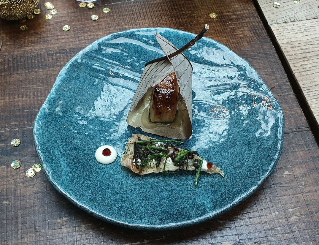 Het volgende gerecht wat we krijgen staat op het kerstmenu van Taiko. Zo wisselen we de gerechten mooi af en krijgen we van beide menu’s wat mee. De gang is een heerlijk stukje kabeljauw. De kabeljauw is geglazuurd met een zacht sausje en wordt geserveerd in een prachtig blad. Erbij komt een dunne cracker met zee groenten, zoals zeewier en zeekraal. Heel smaakvol.