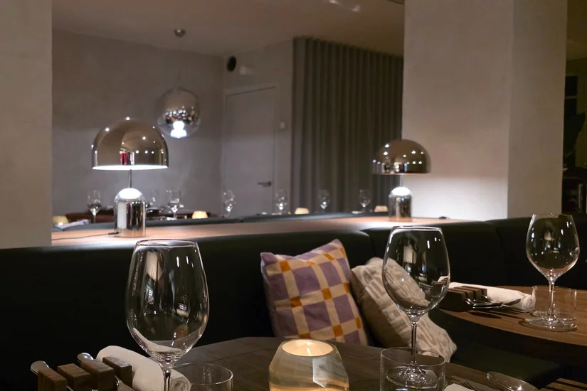 Je kunt niet anders concluderen dat designbureau Concrete een fantastische klus heeft gedaan. Het pand dat we nog kennen van Gin Neo Bistro en Sukhothai kwam bij ons altijd over als een benauwde donkere pijpenlade. Niks van dit alles bij Amice. Je komt hier binnen in een lange gang met een sfeervolle gordijnenwand. Net alsof je de lange hal van een luxe woning binnenloopt. Aan het einde wacht de sta-bar, waaraan je even een drankje kunt doen als je op de tafel wacht. Direct om de hoek loop je het sfeervolle restaurant binnen.