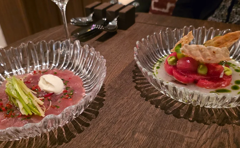 Het andere bordje is een carpaccio van tonijn met een fris pittige julienne gesneden salade van groene asperge, prei en koolrabi. Alle smaken blijven ook hier, zelfs die van de tonijn, proefbaar.