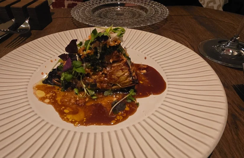 Maar de allerlekkerste jus, naar onze bescheiden mening, komt bij de geroosterde spitskool, die wordt geserveerd met avocado en kervel. De jus is gemaakt van gegrilde groenten en heeft heel lang getrokken, zo wordt ons verteld. Dat zorgt voor een enorme diepte en een breed palet aan groente smaken. Terwijl de kool uit de oven boterzacht is.