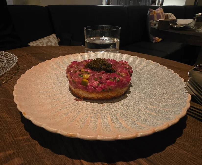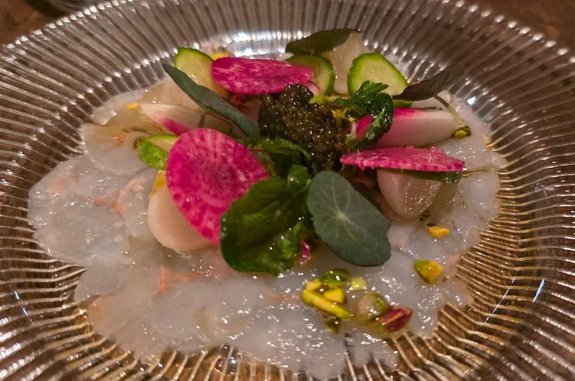 Tussendoor proeven we de steak tartare klassiek gemaakt, licht zurig van smaak op een brioche met een dot kaviaar erop. Plus de rauwe langoustine met pistache, komkommer, radijs en ook hier is het de jus die opvalt. Nu een krachtige olie getrokken van de koppen van de langoustines. Heerlijk, veel meer langoustine kun je niet proeven.