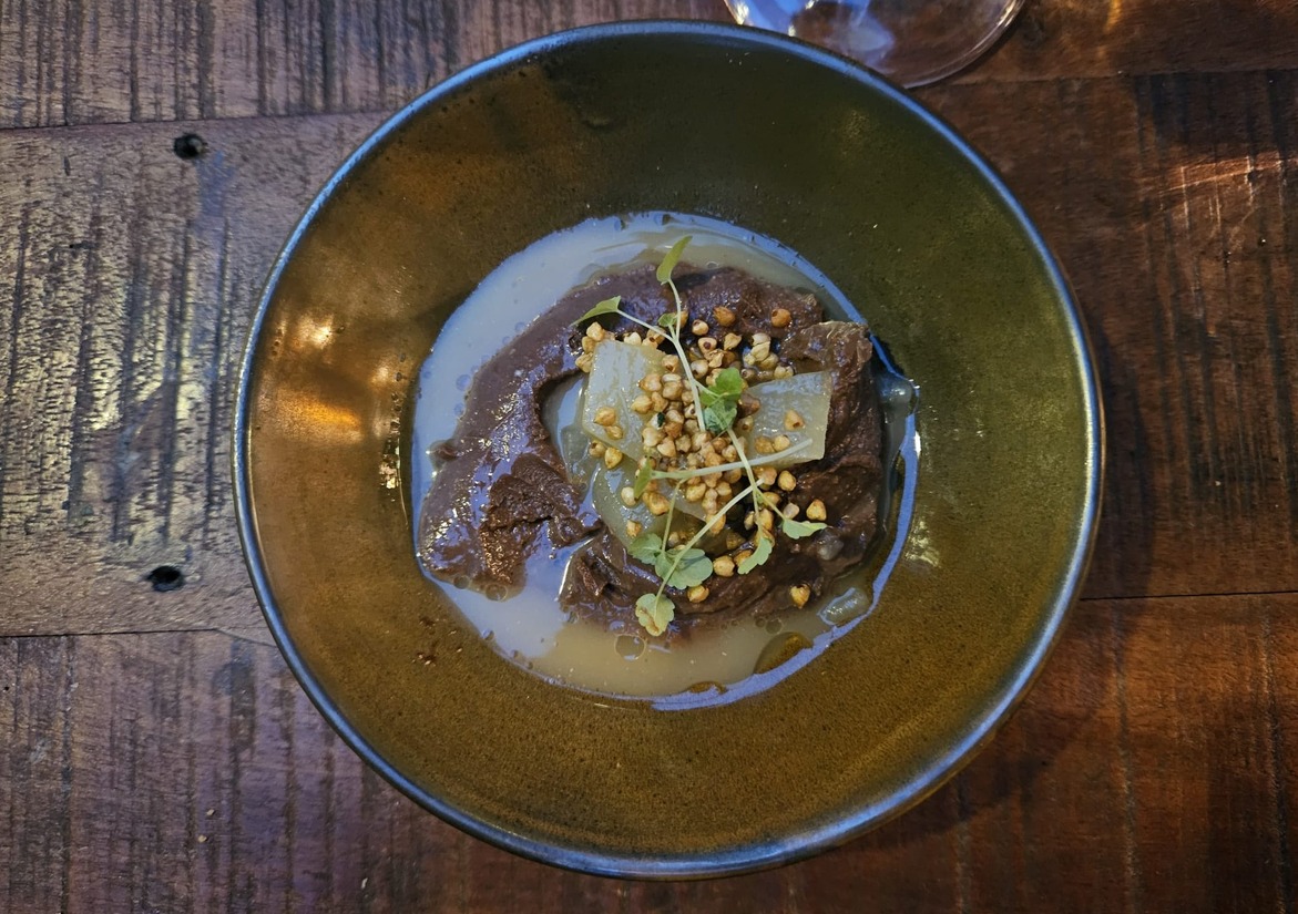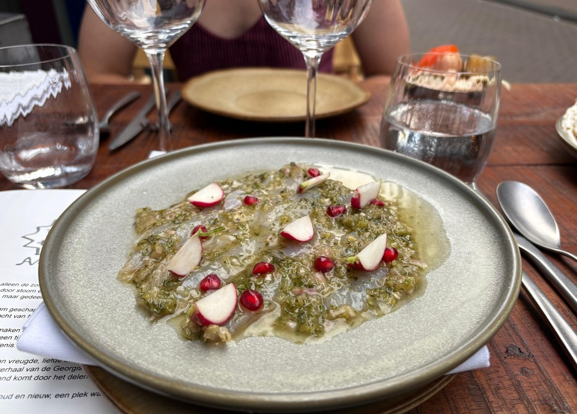 De kaart is overzichtelijk en dat juichen we toe. We starten met brood en opgeklopte boter met Svanetiaans zout: simpel, luchtig en heerlijk. Daarbij ingelegde groenten en twee soorten Pkhali: aubergine en spinazie, beide met walnoot, lente-ui en koriander. Een frisse crudo van zeebaars volgt, bijna als ceviche, begeleid door twee verrassend frisse wijnen. De Labara Tsolikouri Qvevri en de Sanavardo Napareuli gemaakt van twee autochtone Georgische druiven. Een veelbelovende start. Omdat het woensdag is, kiezen we voor halve glazen, zodat we meer kunnen proeven en de volgende dag fris zijn.