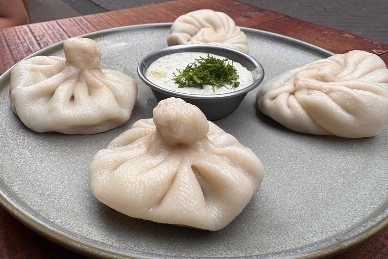 Het hoogtepunt? De Khinkali. Deze Georgische dumpling eet je op rituele wijze: pak het tuutje, draai om, hap aan de zijkant en zuig eerst de bouillon eruit. Daarna dippen in yoghurtsaus. Amra serveert drie varianten: rund & varken, lam, en vegetarisch met aardappel en paddenstoel.