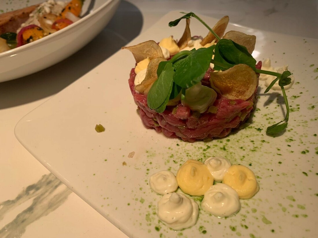 De kaart is overwegend Frans en heeft, ten tijde van ons bezoek, Aziatische invloeden. Eenmaal neergezet aan de chefs table, waar je naast elkaar zit aan een hoge bar met directe inkijk in de keuken, komt dit gelijk mooi naar voren in de amuse die we voor ons neus krijgen: gerookte tofu met een chutney van mango, koriander en een krokante tuile. We besluiten zowel het menu te testen (drie- tot vijf-gangen) als de à la carte. Vooraf ga ik voor de steak tartaar; dit is vaste prik voor mij wanneer ik in Frankrijk ben of uit eten ga dus ik ben inmiddels een redelijk ervaren eter van dit gerecht.