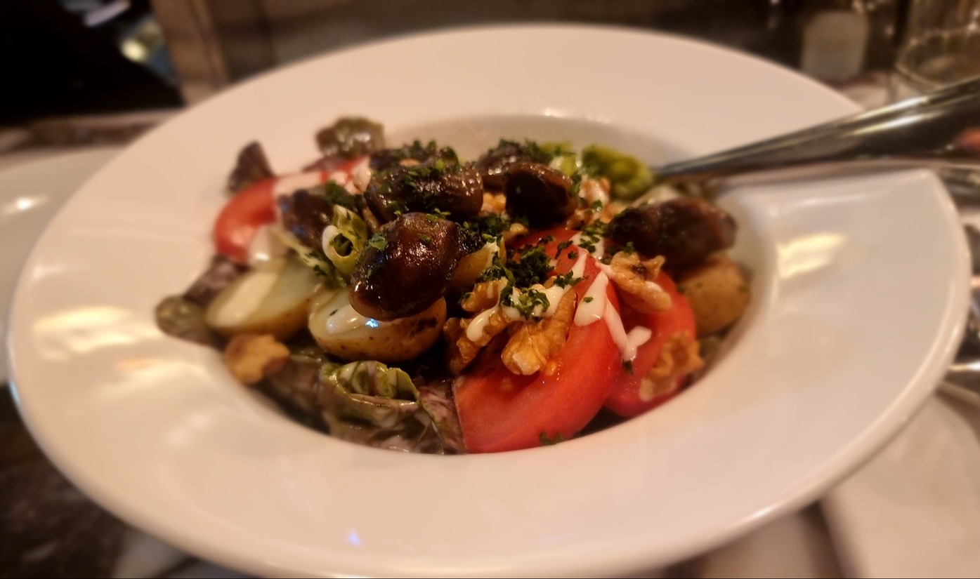 De terrine van eendenlever met een twee stukken krokante brioche en een kleine aangemaakte groene salade wordt geserveerd tegelijk met de salade gésiers. Heerlijk hoor de terrine, maar we zijn direct instant fan van de gésiers. Niks orgaan of lederachtigs, maar een haast elegant lichtkruidige smaak mooi verpakt in een groene salade met tomaat, gebakken aardappeltjes, bieslook en licht getoaste walnoot. Geweldig!