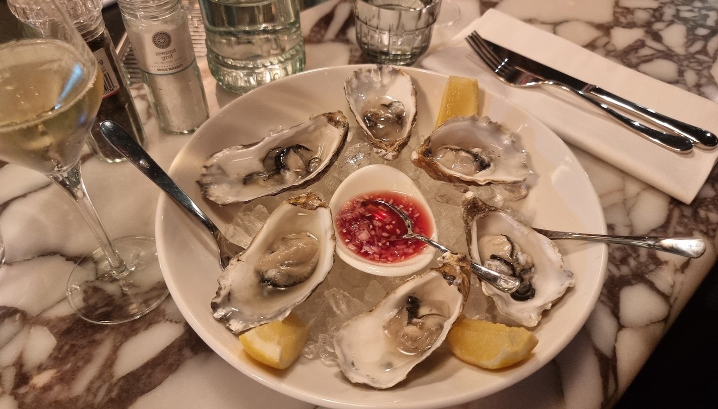 Het feest begon direct met een lekker glaasje bubbels, champagne natuurlijk, en een paar oestertjes. Vakkundig en supersnel geopend door een van de eigenaren en meester oesterman Roel Geijsen (ook mede-eigenaar NAP).