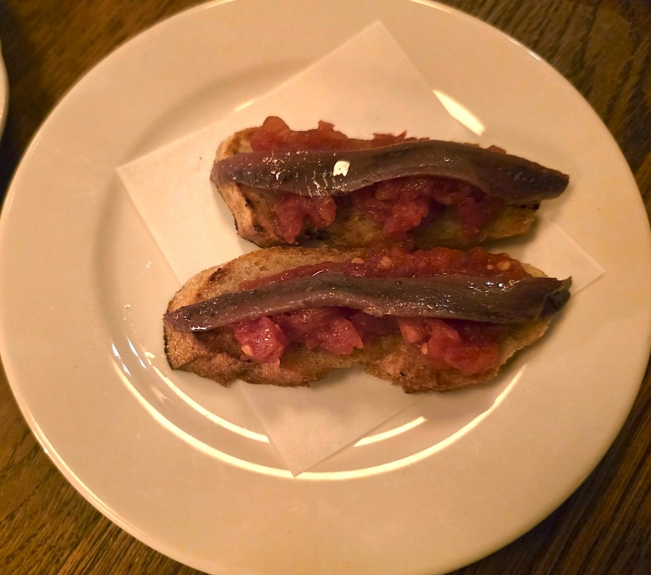 De donderdagavond dat we binnenlopen is het stampend vol. Bij het openen van de haast monumentale deur, met het mooie glas in loodraam er boven knalt de gezelligheid je tegemoet. We ploffen direct aan de bar en starten met een glas Portugese bubbels uit Baraida en een pan-con-tomate met een ansjovis. Je krijgt gelijk het Spaanse ‘gastrobar’-gevoel met veel actie voor en achter de bar.