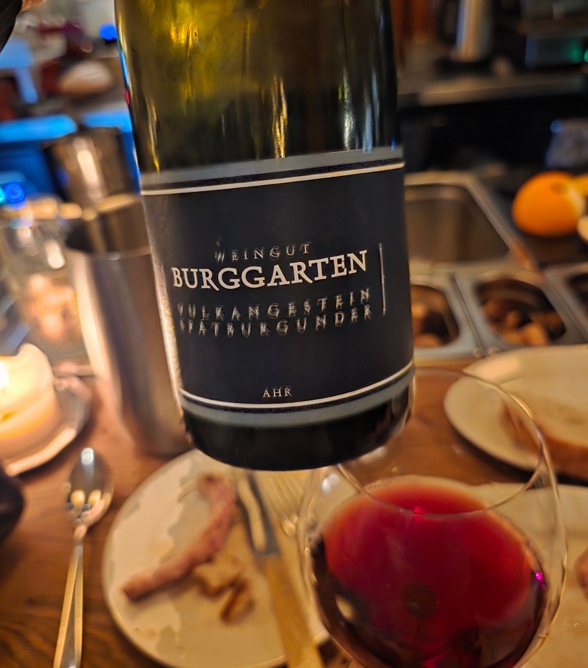 De wijnkaart is niet beknopt. Menig sterrenrestaurant zou zich zo’n kaart wensen. En het leuke bij Vita Lente is, dat je de open wijnen in verschillende volumes kunt bestellen. Ze komen in formaat van een klein glas (80ml), normaal glas (veel < 10 euro), karafje of hele flessen het zijn er meer dan dertig. Inclusief een kleine sectie orange en oxidatief. Alleen al voor de ‘grote’ wijnkaart ga je zeker een paar keer willen terugkomen. Wij besloten na de bubbels voor een van onze favorieten te gaan: een spätburgunder van Weingut Burggarten uit de Ahr, het kleinste Duitse wijngebied op een uurtje of 4 rijden van Utrecht.