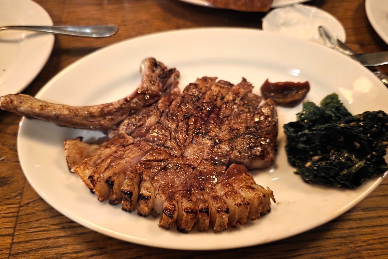 We verheugden ons op de schnitzel die we online op de kaart hadden zien staan. Helaas, die is niet meer. Maar de schnitzel is vervangen door een forse varkenskarbonade. Deze komt al gesneden op tafel. Met erbij wat gegrilde cavalo nero en een sublieme mosterd is dit zonder meer ook een heerlijk gerecht. Wat kan varken, mits goed bereid, toch fijn zijn.