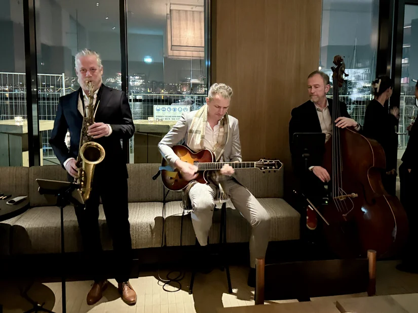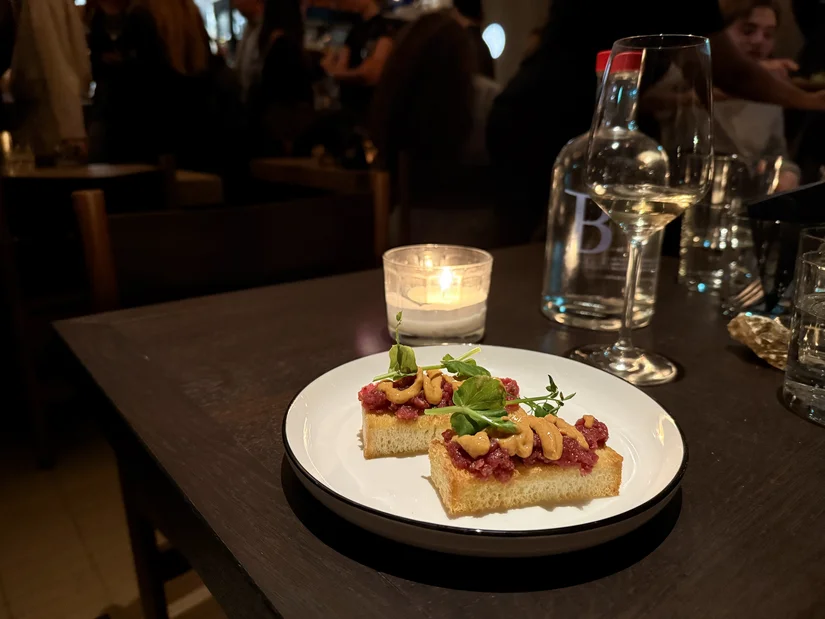 Bij binnenkomst kregen we, naast een feestelijk glas cava, meteen een oester in de hand. Buiten waren de klanken van live muziek al te horen: jazzy, relaxed en precies aanwezig genoeg om de sfeer te dragen zonder gesprekken te overheersen. Daar sluit de inrichting naadloos op aan, met veel hout en warme tinten die bijdragen aan het levendige maar ontspannen karakter. Het is zo’n sfeer waarin je als het ware wegzakt.