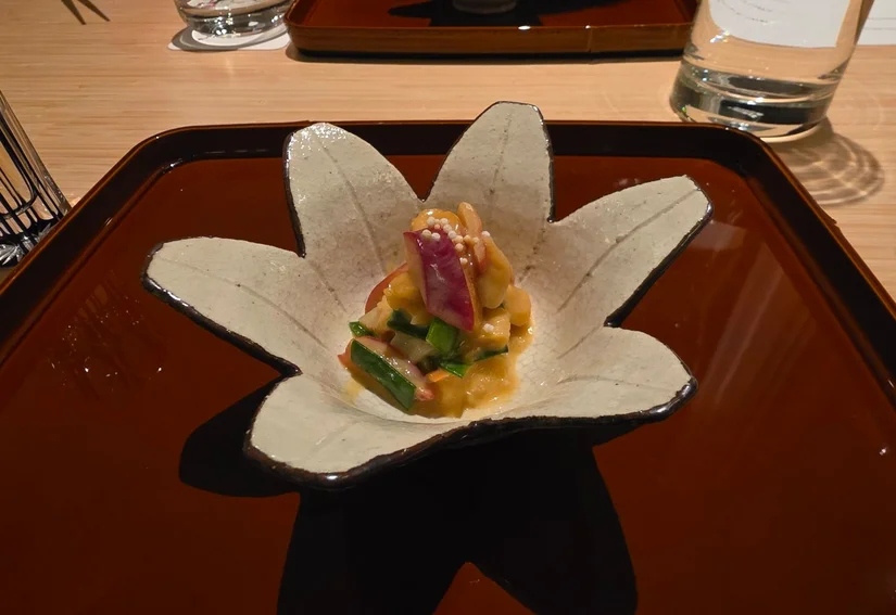 Zoals het hoort krijgen we een (nu extra) warm doekje om onze handen schoon te maken en een bodempje sake om het lichaam te verwarmen. Hoe attent. Na uitleg wordt de amuse gepresenteerd. Op een wonderschoon schaaltje in de vorm van een openstaande bloem komt een kleine salade met krab en een indringend smaakvolle miso-dressing.