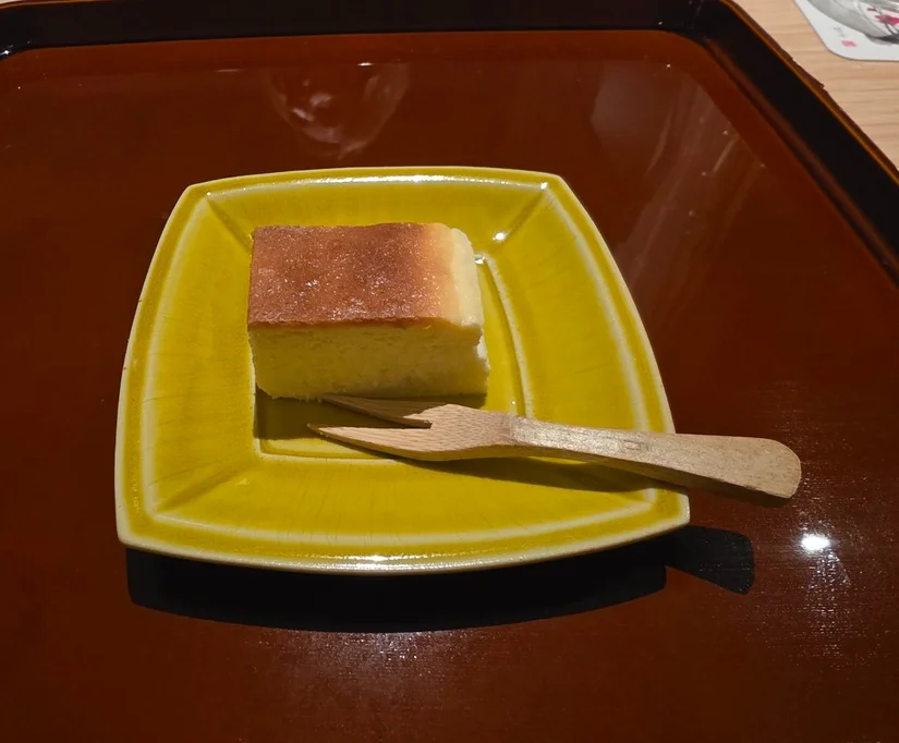 Daarna volgt nog een heel fijn schaaltje rijst met stukjes garnaal, asperges en zoete aardappel. Het diner wordt afgesloten met een stukje van de Japanse variant op de cheesecake. In dit geval een meer soufflé-achtige cake, luchtig en niet zo zwaar als de Baskische variant. Een fijne afsluiter van de avond.
