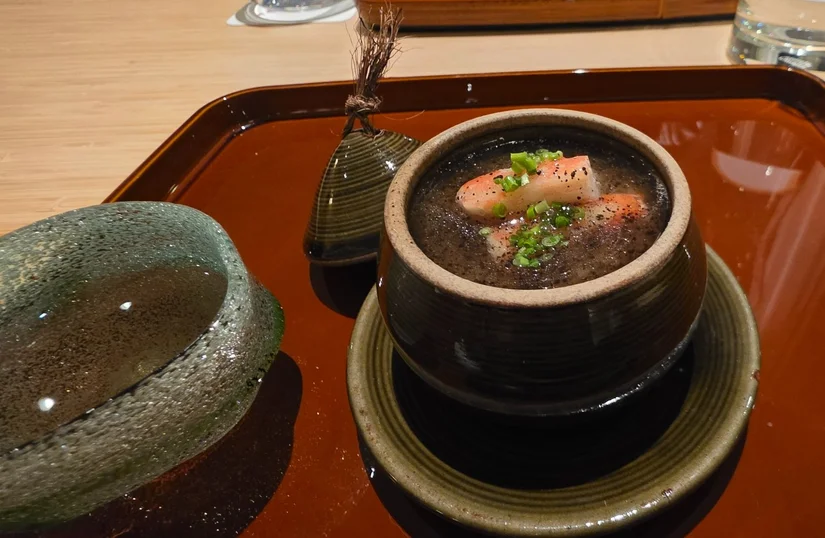 Als eerste gerecht volgt de signaturen van de chef. Een gestoomd gerecht dat het midden houdt tussen een dikke soep en een hartig puddinkje, gemaakt met ei en custard. Waarbij Hatsune een speciaal filter gebruikt om zoveel mogelijk de zachte kwaliteit van het Japanse water te benaderen. Even terug naar de soep, deze noemt de chef zijn signature. De custard is heerlijk romig, de stukje krab passen perfect maar de saus van zwarte truffel maakt het geheel een geweldig mooi gerecht. Smullen.