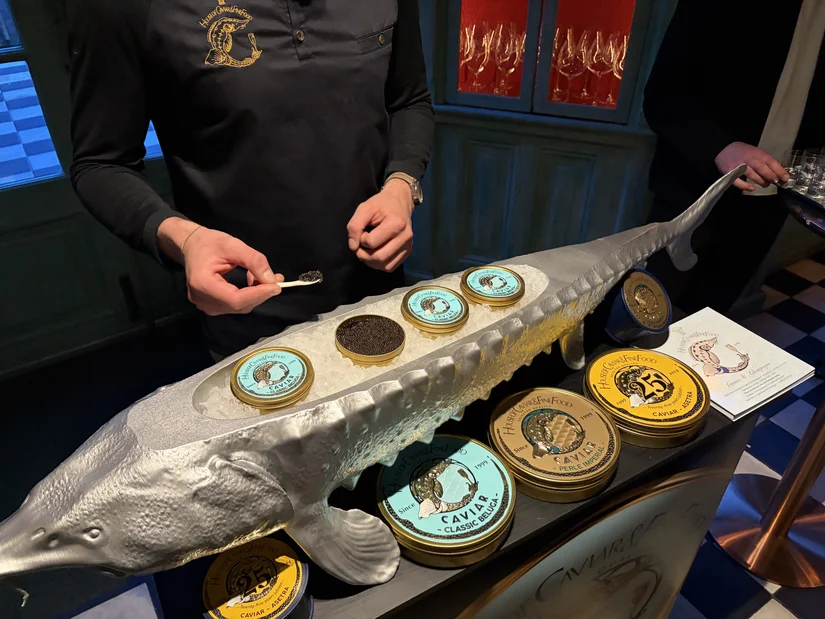 De toon wordt direct gezet met een klassieke, maar lang niet meer geziene combinatie: kaviaar en wodka. De combinatie die in het Oosten eeuwen teruggaat is nu ook weer geweldig. Waar champagne tegenwoordig vaak de klassieke partner is, brengt de wodka hier juist een zuivere, bijna scherpe elegantie die de zilte diepte van de kaviaar versterkt.