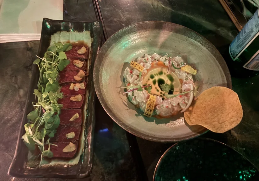 De zeebaars ceviche is daar een goed voorbeeld van, met zoete aardappel, mais, yuzu en chili. De beef tataki met ponzu en zwarte peper, is strak en puur, terwijl de wagyu carpaccio met truffel en wasabi juist een rijkere, meer aardse diepte toevoegt.