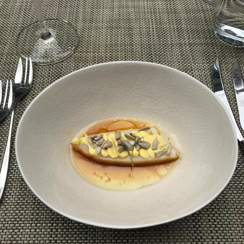 We starten met een aperitief van biodynamische cava, geserveerd met een luxe variant van studentenhaver (met gezouten macademianoten en wasabinootjes in de mix). De trend van biologische en duurzaam geproduceerde wijn, in kleinere oplage, is terug te zien in de wijnselectie. De bediening vertelt er liefkozend over, alsof ze de makers allemaal persoonlijk hebben ontmoet. Zoveel enthousiasme werkt aanstekelijk!