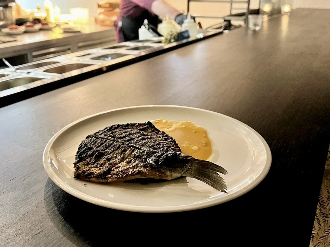 Er wordt gelukkig nog steeds op vuur gekookt. Dat is wel duidelijk als we binnenkomen. Ondanks de mega afzuigkappen komt de geur van rook en maillard je verleidelijk tegemoet. Dat is misschien niet voor iedereen, maar het vergroot bij ons de voorpret als wij aan de keukenbar plaatsnemen.