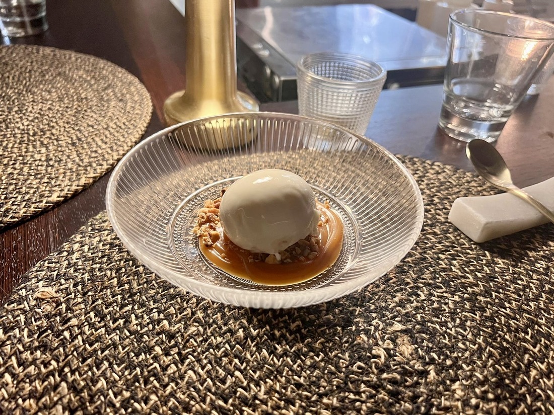 Op het vuur wordt ondertussen al een gefileerde zeebaars op de huid gebakken, met ‘Kakavia’, een Griekse vissoep. Een perfect gegaarde vis. Wat ons betreft vat dit bord het nieuwe format van KAIA het beste samen. Stijlvol en minimalistisch in opmaak, maar maximalistisch in smaak.