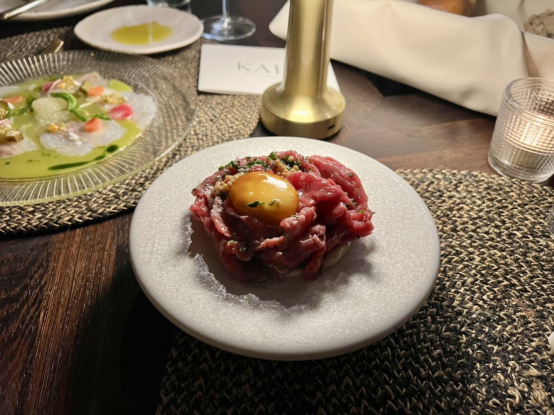 Het meest bestelde gerecht bij KAIA is de carpaccio. We sputteren even tegen, maar eigenaar Sotiris Evstratiades verzekert ons een hit. Het vlees wordt met de hand gesneden. In dikkere stukken zodat er echt iets te eten is. Op het bord gedraaid als roos met mosterdkaviaar, een eigeel en een vleugje Griekse brandewijn (Tsipouro) voor een extra kik. Een presentatie die het natuurlijk goed doet op Instagram.