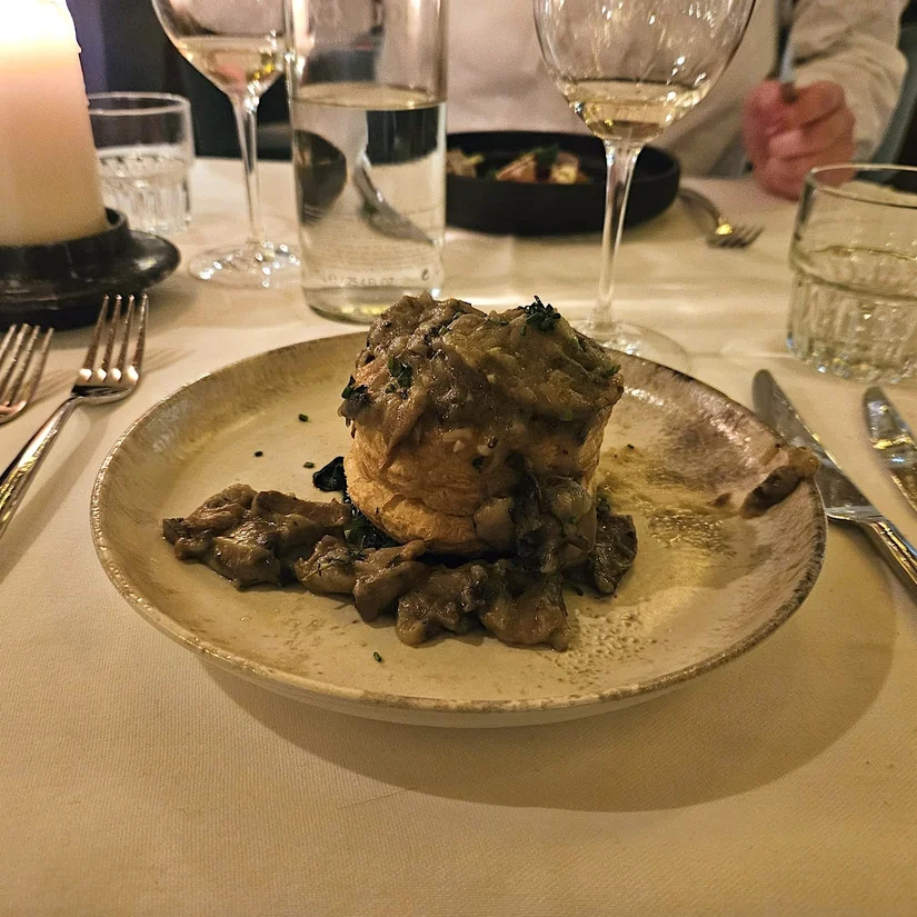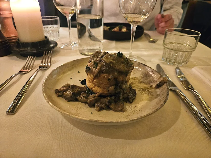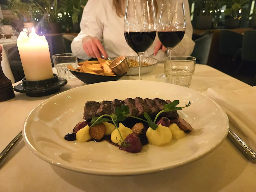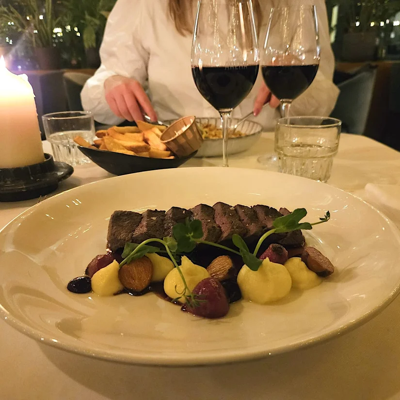 Als hoofdgerecht kiezen we hertenbiefstuk met port- en wildjus: rijk, vol en perfect winters, al had het vlees nét iets meer rosé gemogen. De risotto met pompoen en blauwe kaas is een fijne verrassing: romig, hartig en mooi in balans. We zitten inmiddels goed vol, maar een affogato laten we natuurlijk niet schieten. Leuk detail: die wordt niet kant-en-klaar geserveerd, je mag de koffie en de frangelico zelf inschenken. Handig als je meer team-koffie of team likeur bent.