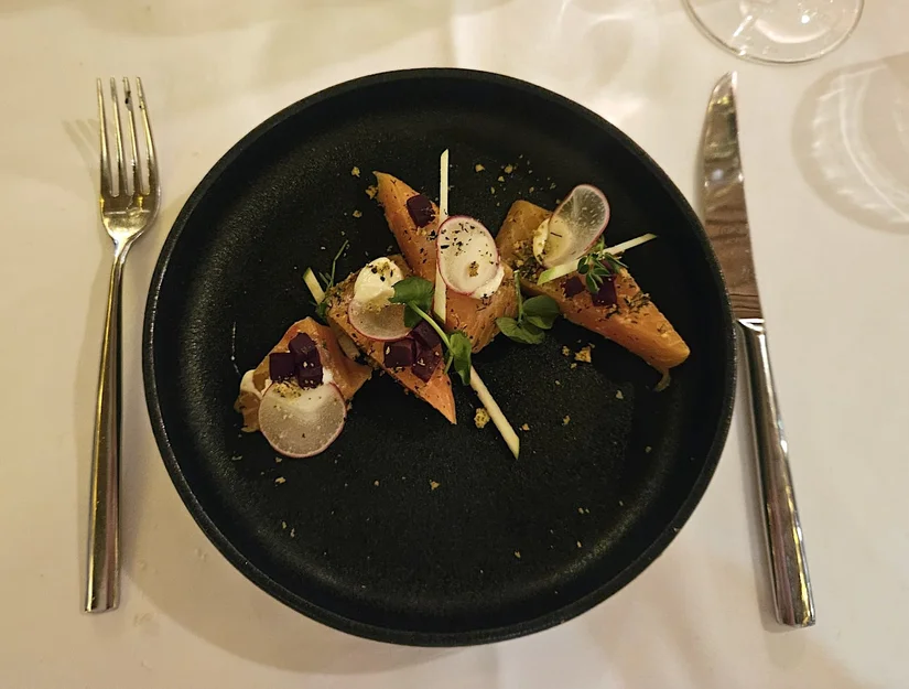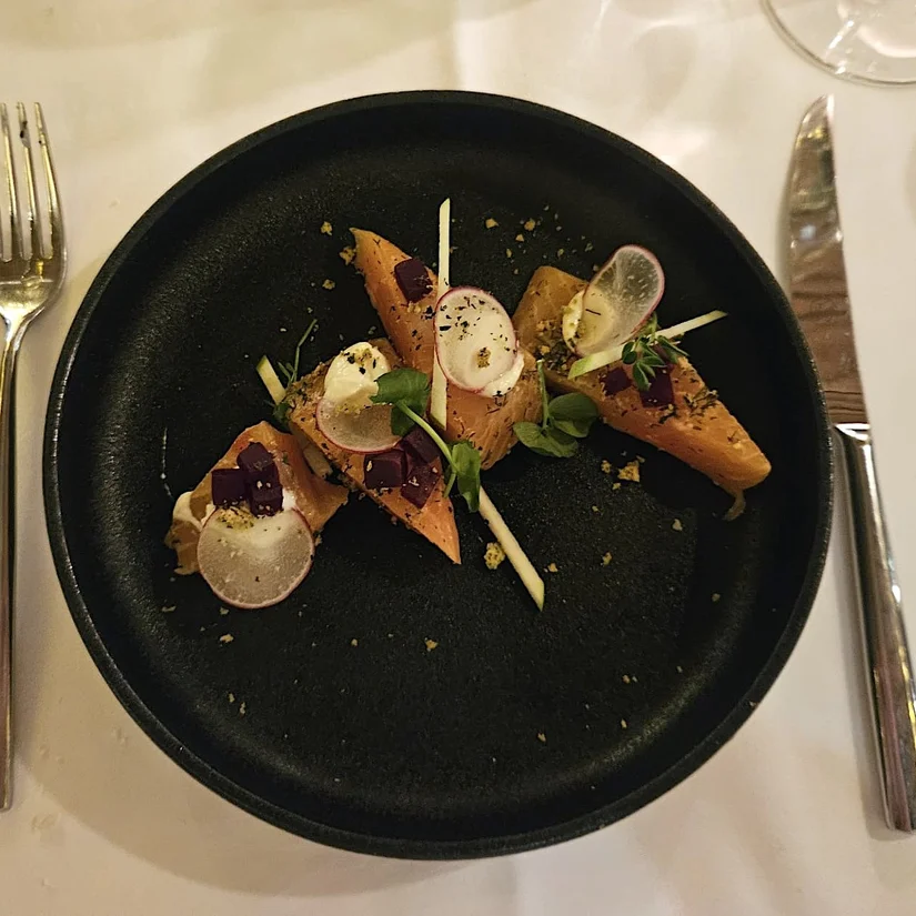 Buiten sneeuwt het als we aankomen en dankzij de grote ramen aan de voorkant lijkt het restaurant bijna een decor uit een winterfilm. We glijden bijna over de houten vlonders naar binnen. Bij binnenkomst voelt het meteen gezellig. Mensen warmen zich op bij het haardvuur, in het midden staat een ruime bar en vanuit de open keuken zie je het oprechte plezier bij het team.