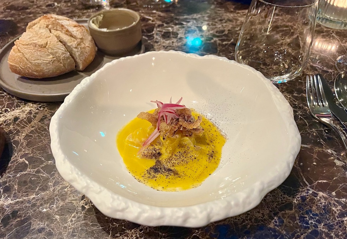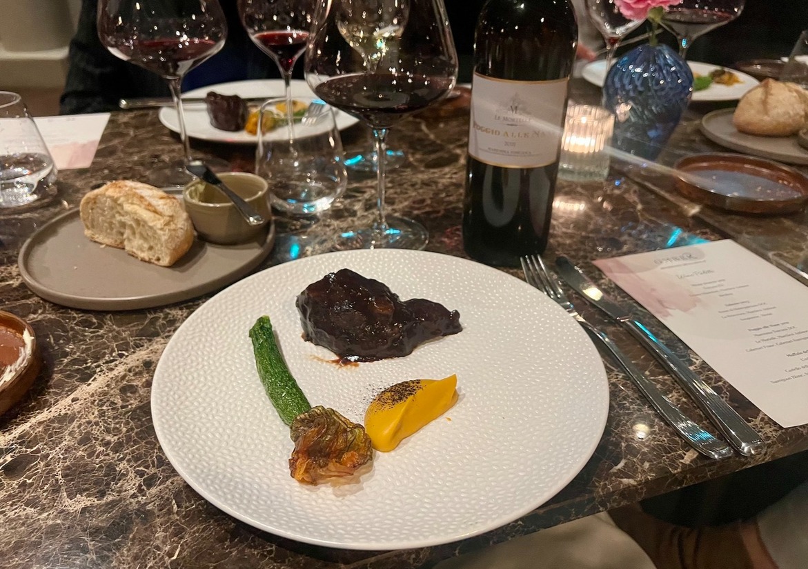 Vandaag proeven we verschillende wijnen uit haar portfolio. Zoals een rijpe Riesling uit 2021 van wijngaarden van Tenuta Monteloro bij het eerste gerecht: ceviche met tempura van pijlinktvis. Een diepgekleurde saus en goeie bereidingen van vis. De smaak is echter wat aan vlakke kant. Gevolgd door bloemkool met bimi in ajo blanco, een koude soep uit Andalusië. Een fris, maar opnieuw licht gerecht.