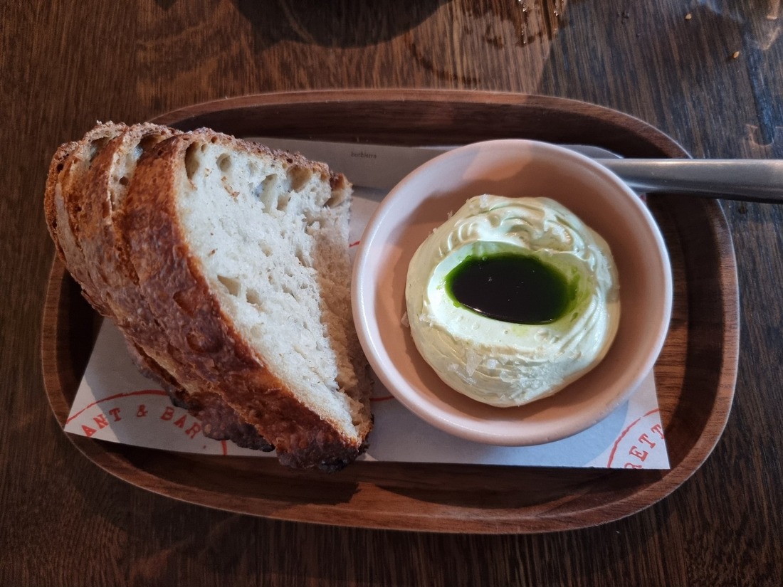 De Buik at hier misschien wel het beste desembrood ooit. Dat dagelijks wordt geleverd door een speciale leverancier. ‘Dat is een vriend die in het verleden bij BAK heeft gewerkt en zich in de lockdown heeft bekwaamd in het maken van desem. Hij levert alleen aan de horeca waarbij wij een van zijn eerste klanten zijn.’ Het brood is minder ‘nat van binnen’, heeft luchtigheid een verrukkelijke korst en wordt geserveerd met geslagen boter en een kruidenolie.