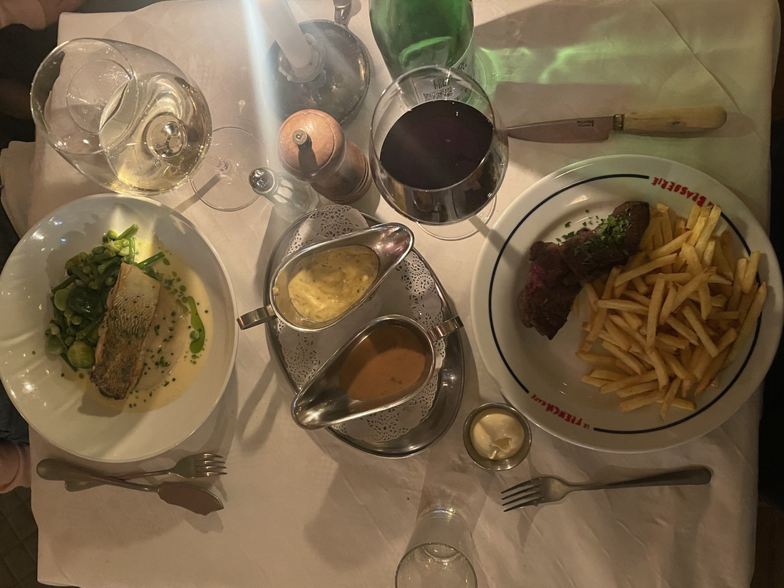 Voor het hoofdgerecht kon de steak frites natuurlijk niet ontbreken, net als de poisson du moment—dit keer de zeebaars. De twee zilveren schaaltjes met zowel bearnaisesaus als pepersaus waren perfect op smaak. Beide uitstekende en belangrijke toevoegingen voor de steak. .