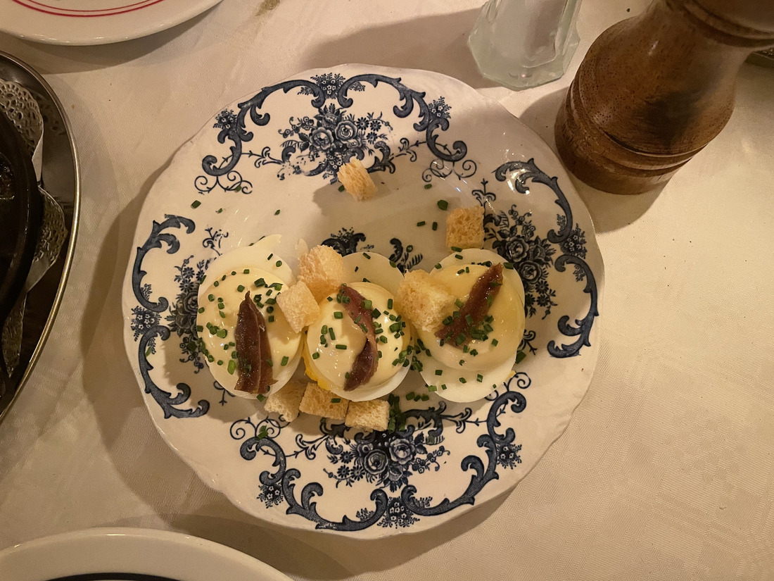 Op de kaart staan zeker de Franse klassiekers, en die hebben we dan ook gelijk maar besteld. De koude, gekookte garnalen met citroenmayonaise—een persoonlijke favoriet—waren goed, alleen een beetje messy, maar dat kan ook niet anders met dat gerecht. De kippenlever crème op brioche met bosbessenconfituur was ook erg smakelijk.