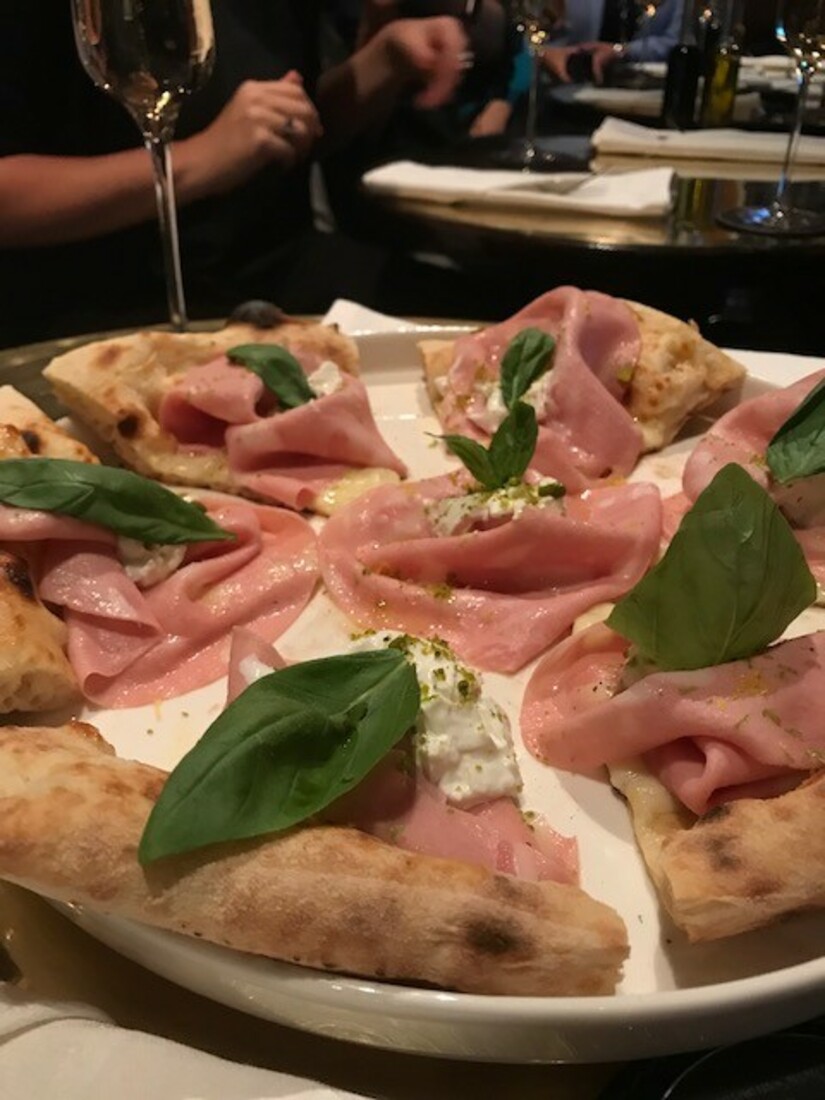 Na het bakken is het tijd om de verschillende pizza’s van het Hilton menu te proeven. Op het pizza en champagnemenu van het Hilton vind je niet alleen klassiekers zoals de pizza Margherita en Marinara. Ook kun je er bijzonder lekkere combinaties eten zoals gerookte zalm, crème fraîche, citroenzeste en dille: één van onze favorieten. Ook de pizza met mortadella (Italiaanse worst van varken) met burrata, basilicum en pistache viel goed in de smaak. De champagne vloeide rijkelijk en was, inderdaad, de perfecte partner bij de chique streetfood.