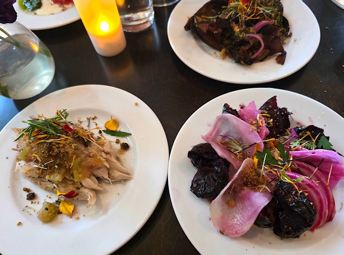 Het andere bordje heeft verschillende bereidingen van biet. Van gepotte rode biet tot rauwe dunne plakjes chioggia biet. Geserveerd met een karnemelk kwark. Ook weer simpel maar smaakvol.