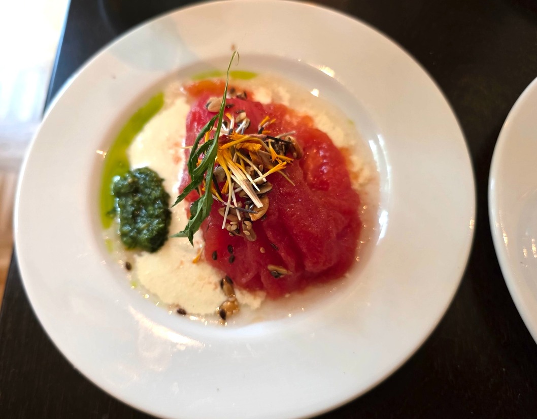 Het eerste bordje dat op tafel verschijnt is een geheel geroosterde gepelde tomaat met een amandelsaus en een pesto van Oost-Indische kers. Simpel, maar heerlijke combinatie van smaken.