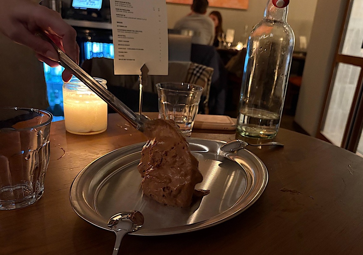 Als afsluiter namen we de chocolademousse, die licht theatraal uit een grote zilveren schaal werd geschept op een mooi zilveren bordje. Deze zachte romige mousse, met als tip om er een beetje zeezout overheen te doen, was een goede afsluiter van een gezellige avond.