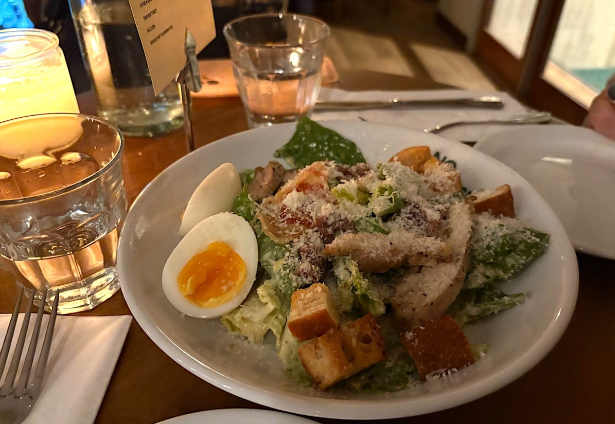 Na het eten van deze drie gerechten hadden we toch nog een klein beetje trek en kozen we ervoor om de caesarsalade, met gegrilde kip, te delen. Wijntechnisch, de kaart is ook vrij no nonsense, gingen we voor de volle en sappige primitivo, een allemansvriend bij de gerechten.