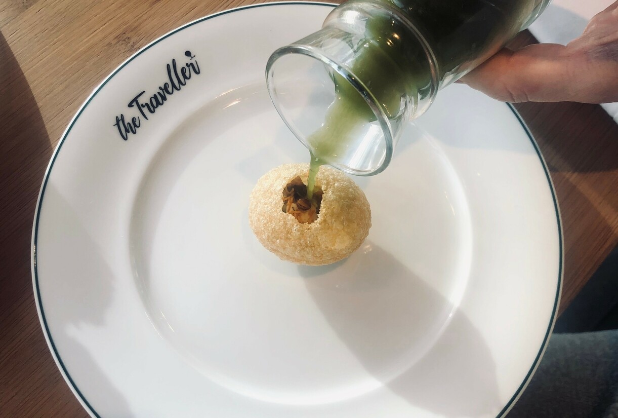 Hartelijk welkom geheten door Nael, een van de oprichters en geen onbekende in de Amsterdamse restaurantwereld, nemen wij plaats op een bankje en kiezen wij ervoor ons te laten verrassen door middel van een brunch. Bij The Traveller betekent dat een aantal kleine gerechten, geïnspireerd op verschillende delen van de wereld, die je met je tafelgenoot kan delen. Alle gerechten komen in één keer op tafel en kijkend naar al het kleurrijks en lekkers voor ons besluiten wij te beginnen met een warm gerecht; shakshuka, een pittig Oosters eiergerecht. Als echte gastheer laat Nael ons daarop volgend één van zijn favoriete gerechten proeven; Pani Puri, zeer dun en krokant bolletje, gevuld met kikkererwten, munt en rode ui, waarin een koriander-‘jus’ wordt ingegoten. Niet alleen zeer verrassend door die smaakcombinatie, maar ook zeker een lust voor het oog.