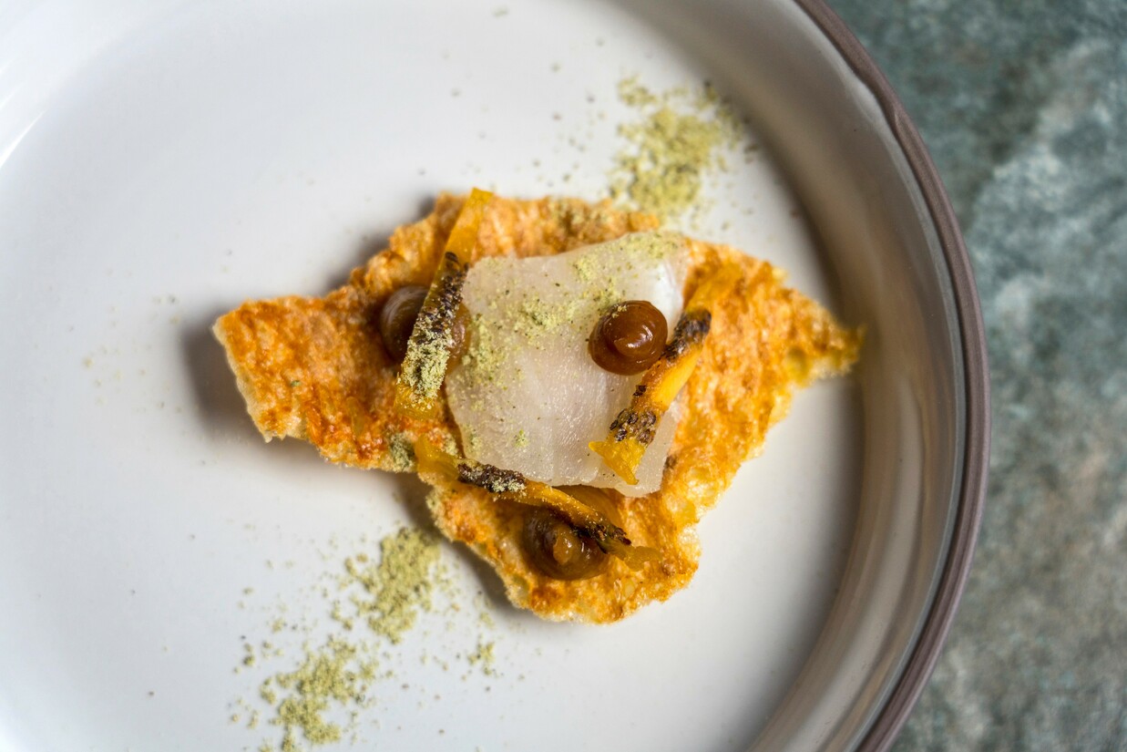 We beginnen met een amuse die qua smaken alle kanten op vliegt, met gepofte huid als basis. Daarmee is het een waardig intro: hier wordt bevraagd, geprikkeld en heel leuk gekookt. Onmiskenbaar wordt de lijn ingezet door de huid van de vis te gebruiken en daarmee meteen een verhaal en de missie te kunnen vertellen. De smaken erop prikkelen en zijn overweldigend, maar dat maakt het wel een leuke amuse.