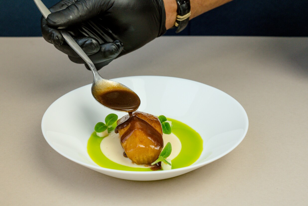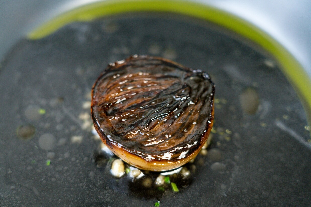 “Alles aan een heilbot is groot”, aldus de chef, wat betekent dat de opties legio zijn. Wat opvalt in het menu is dat er vaak heilbot in is verwerkt als ondersteunende rol. Want, zegt Steba, “dan kan je echt goed circulair werken”. Van een deel van het visvlees maakt hij ‘spek’, dat een gerecht met pompoen een zoute kick geeft. De hele bosui komt met een saus op basis van het vet van de vis.