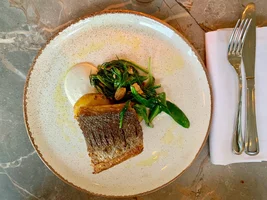Op het kleine menu treffen we veel groenten maar ook niet-plantaardige eiwitten. Voorgerechten zoals de bisque, een ceviche van heilbot en een soort tomatensalade met geitenlabna en hoofdgerechten zoals kokkels met venkelpapardelle, zeebaars, kalfswang en vier bereidingen van knolselderij. Ook zijn er oesters en schiet er een schitterende plank met charcuterie voorbij.