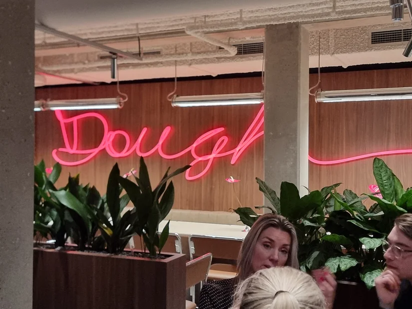Restaurant Janine zit in een ‘kelder’ op het Hekelveld in Amsterdam als onderdeel van het Renaissance Hotel met voorin een bakkerij. ‘Een kelder’ klinkt donker, maar zo voelt het niet. Integendeel. De ruimte is modern, ruim en warm. Blikvanger is de grote glimmende pizzaoven. Die geeft meteen richting aan de avond. De stoelen zijn fijn, de lijnen strak en er is genoeg licht. Op de muur brandt in rode neonletters het woord dough. Dat zet de toon: hier draait het om deeg en vuur.
