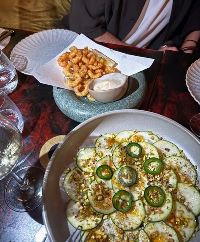 Op tafel verschijnt het ene mooie bordje na het andere: carpaccio van wagyu, tonijn tataki met ponzu en krokante calamari met een dashi mayonaise. Allemaal erg smakelijk en bij uitstek goede gerechten om met een groep te delen. De carpaccio van courgette wordt geserveerd met een romige feta crème en fijn gehakte pistachenootjes, niet zo ‘steeped in Japanese precision’ maar wel lekker! Hetzelfde geldt voor de pasta met kreeft, niet subtiel, wel onweerstaanbaar.