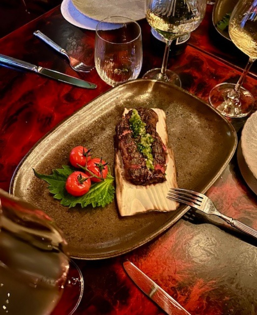Ook wordt er opnieuw Wagyu geserveerd, dit keer is het gebakken bavette met kizami wasabi salsa, deze variant van wasabi is geraspt en daardoor minder scherp dan de pasta die je bij sushi eet. Om het feest compleet te maken komt er nog een salade van verschillende soorten tomaten bij.